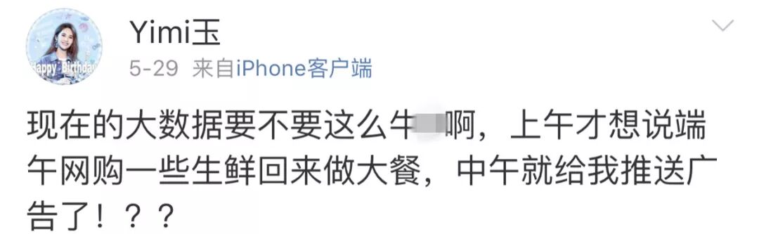 在微博上,有关精准推送变“惊准推送”的讨论不胜枚举。一位微博网友表示,某社交APP的精准推送太可怕,刚下载了某款游戏,50%的热门内容都是关于这款游戏的;有网友表示,聊天提到了秃头,结果一些社交APP、问答APP、搜索APP纷纷推送了植发广告。