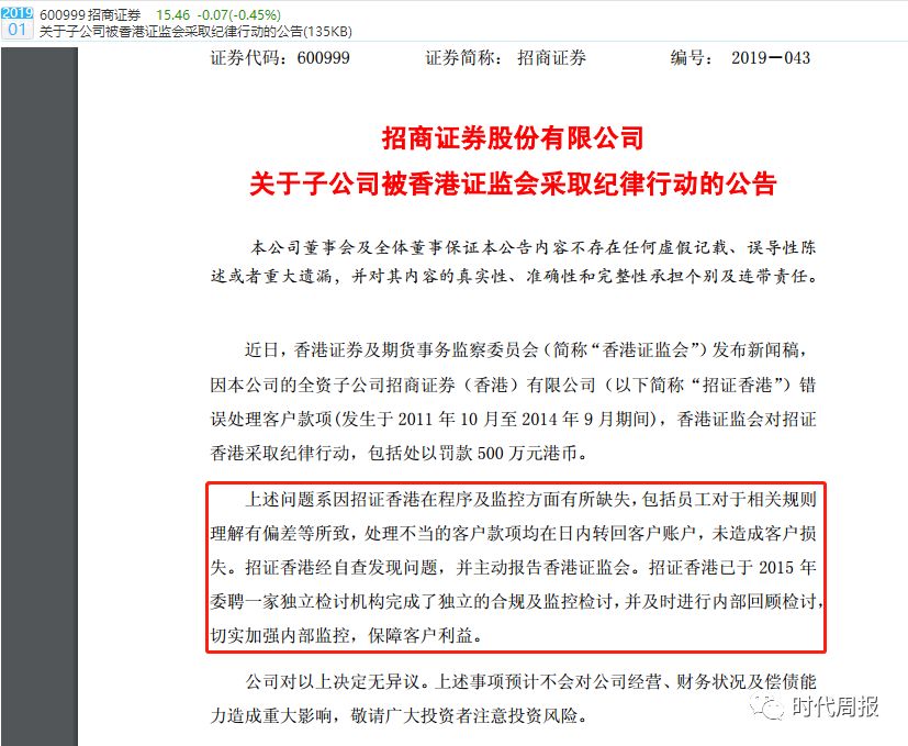 30日的处罚,港证监公告给出的原因是因招商证券香港错误处理客户款项有关的监管违规事项及内部监控缺失。