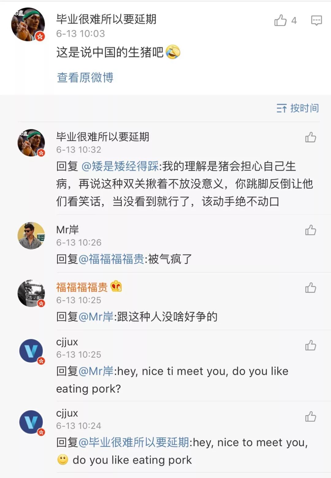 但这样的“强行洗地”怎么看怎么别扭,这个“你”应该指的是读到这篇文章的人,我既然是人,又怎么会“如果是猪”呢?再者说了,我吃中国的猪肉怎么了?您这句话是什么意思?解释不通了。
