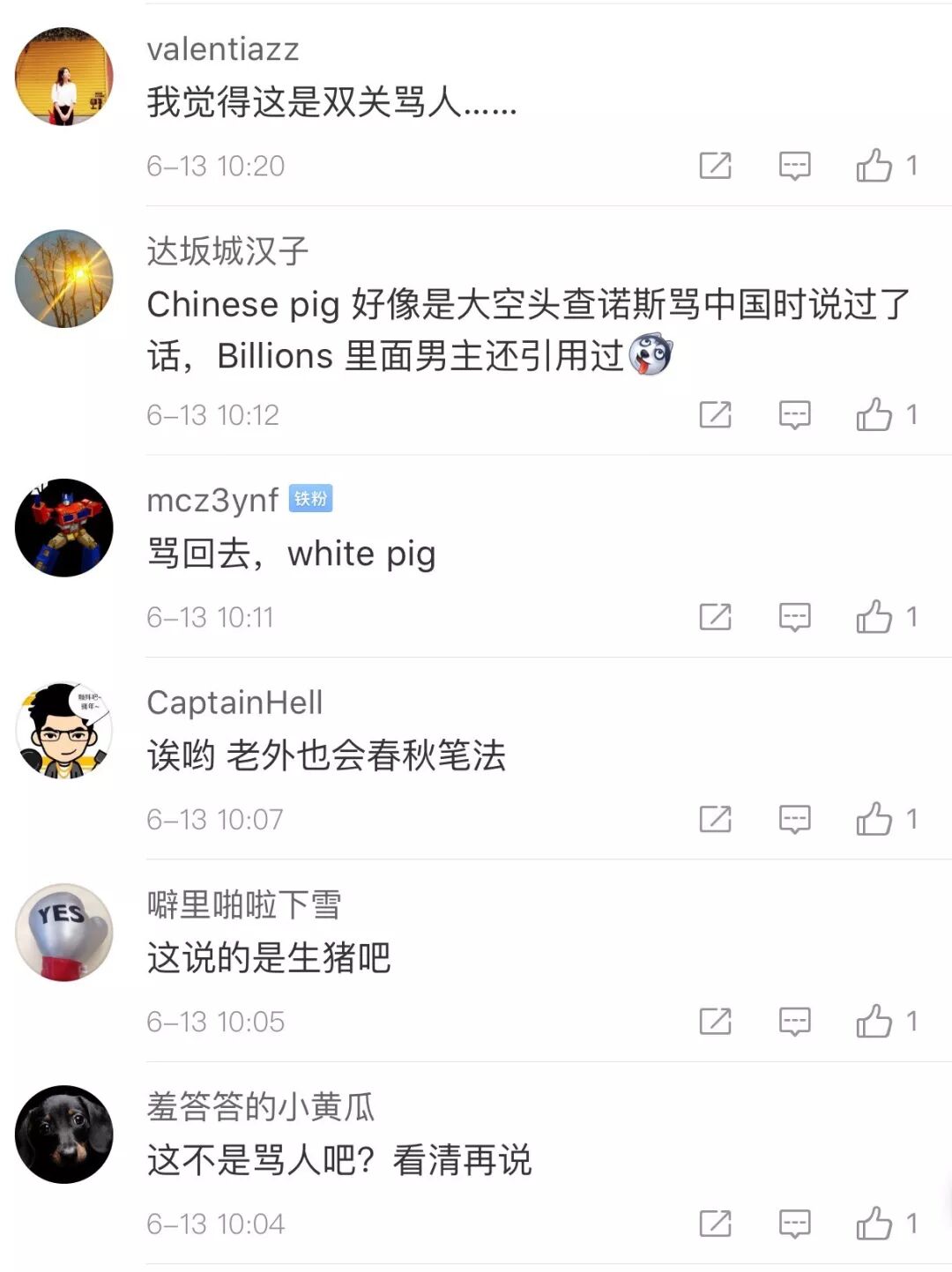 是不是读着很奇怪?我直译为了“中国的猪”,加了个“的”,貌似还没有歧义;但常识要求我别这么傻啊,毕竟不能揣着明白装糊涂,一直到今天,在不少美剧、好莱坞大片以及西方人的社交网络里,那句歧视用语“Chinese pig”,都还没有从他们的口头语中消失。