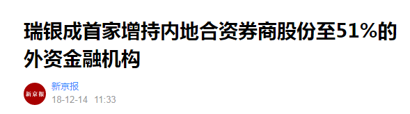要知道,在我国的金融开放历程中,UBS——瑞银一向都是最积极的角色之一。不仅早早在2006年就参与对原北京证券的重组,参股了瑞银证券,而且在2018年4月中国证监会正式发布允许外资持股合资券商可达51%的相关政策之后不久,就马上跟进,并于2018年12月完成对瑞银证券51%股份的变更手续,控股成功。