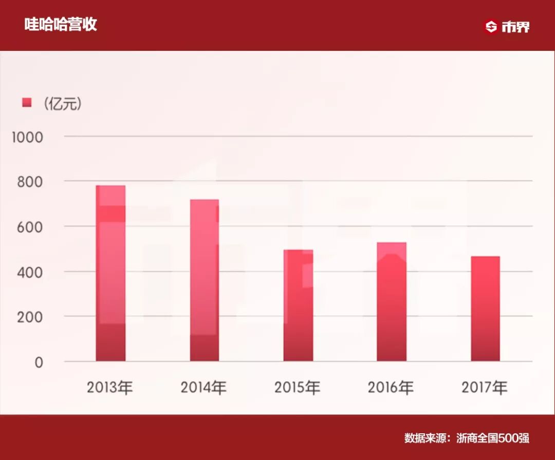 2013年,一路高速增长的娃哈哈营收达到783亿元,早已成为中国首富的宗庆后放话,2014年要实现千亿目标,甚至要再造一个娃哈哈。但是2014年,娃哈哈营收下降到720亿元,而且止不住地下滑,到2017年,营收仅为465亿元,四年下滑了40%。