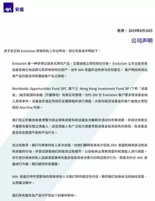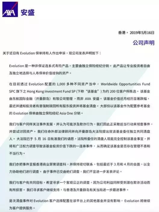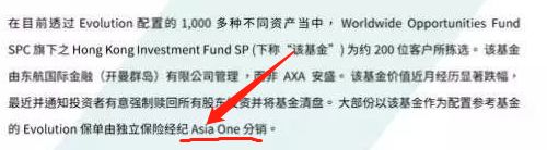 3、Worldwide Opportunities Fund SPC 旗下之Hong Kong Investment Fund SP由东航国际金融(开曼群岛)有限公司管理,为约200位Evolution客户要求将该基金纳入其保单中。该基金价值近月经历显著跌幅并进行清盘。大部份投资该基金的客户由独立保险经纪Asia One代表。