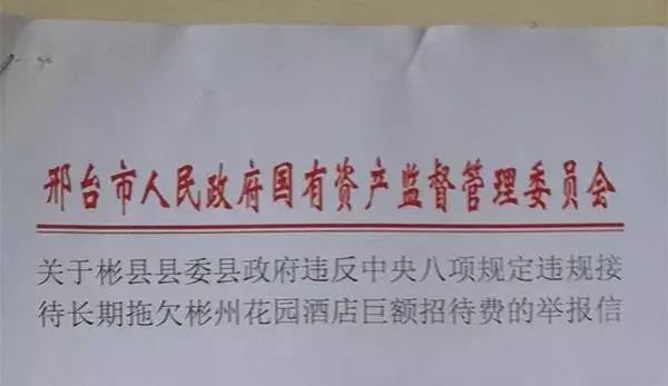 5月27日,有媒体刊发了一份抬头为邢台市政府国有资产监督管理委员会的红头文件,内容是《关于彬县县委县政府违反中央八项规定违规接待长期拖欠彬州花园酒店巨额招待费的举报信》。