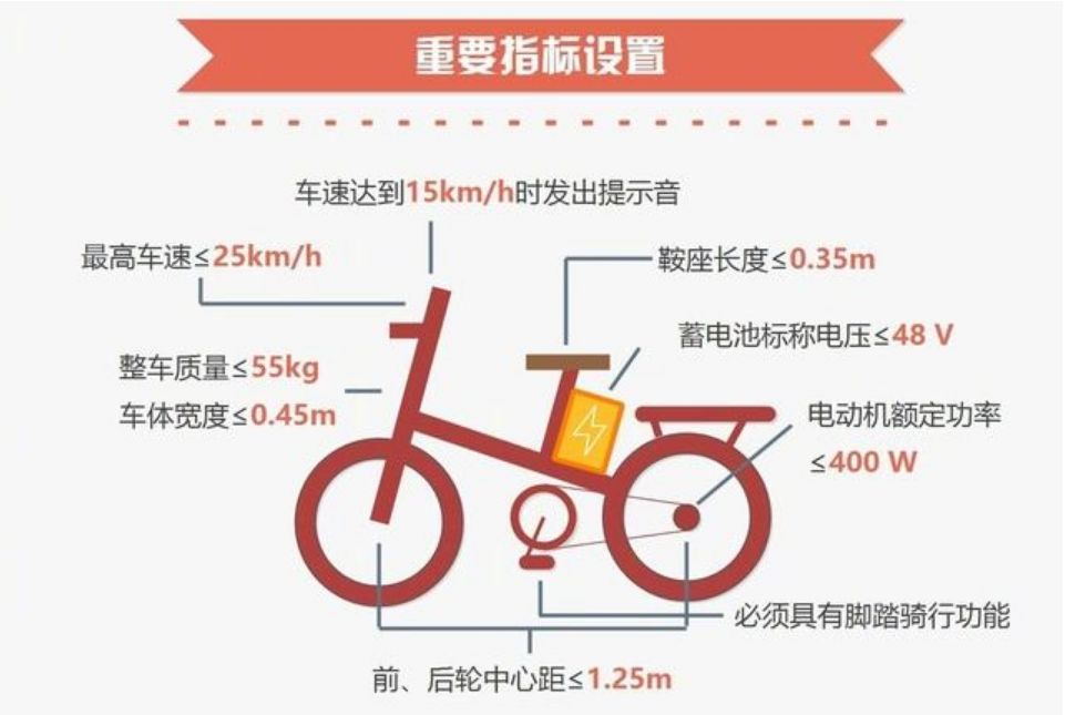 新国标规定,一款符合国家标注的电动自行车必须有脚踏骑行能力、最高车速不超过25km/h、整车质量不超过55公斤,电机功率不大于400W、电池电压48V。缺少以上任意一条,将会被视为“超标车”。
