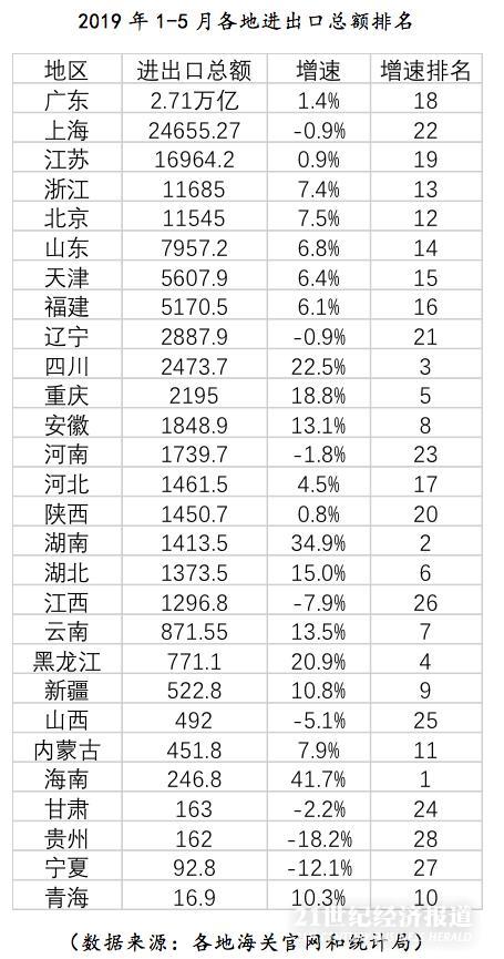 截至6月26日,全国已经有29个地区公布了2019年1-5月的进出口数据。对此,21世纪经济报道对上述29个地区的进出口数据进行了统计分析。