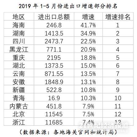 从进出口总额增速方面来横向比较,有4个地区的增速超过20%,海南以41.7%的增速高居榜首,湖南、四川、黑龙江的增速分别为34.9%、22.5%、20.9%,分列第二至四位。
