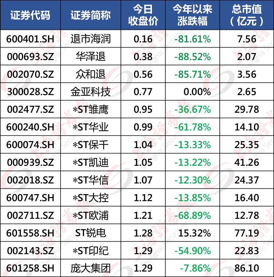 个股方面,史上最便宜A股“花落”退市海润,以0.16元/股的价格,刷新了历史纪录。除了退市整理期的三只股票,金亚科技、*ST雏鹰、*ST华业也加入了“仙股”行列,股价分别为0.77元、0.95元和0.99元。