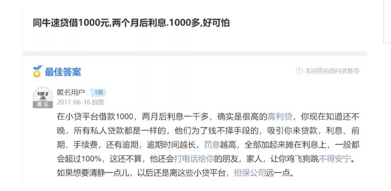 此前媒体报道称,朱晟卿公司产品“同牛速贷”(后为“一信贷”)是七天贷,属于“714高炮”,利息远超法律规定的36%的红线。知情人士透露“同牛速贷”是“借款1800元,到款1100元”,“逾期几小时就被恐吓威胁、发短信侮辱”。