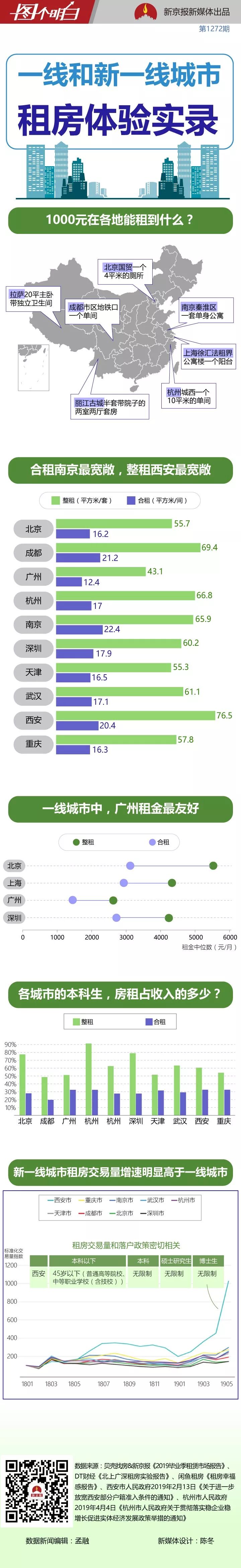 新京报综合几家租房报告发现,新一线城市中,南京合租和西安整租会住的比较宽敞。一线城市中,广州租金最便宜。