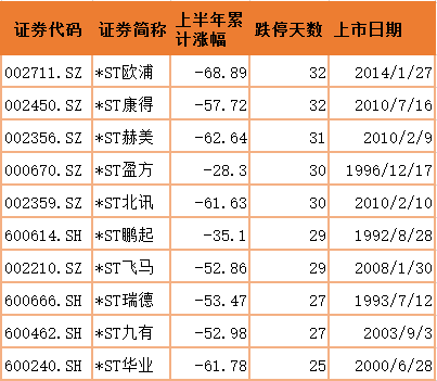 以跌停板数量来排序的话,排名靠前的股票均为ST股。其中*ST欧浦、*ST康得、*ST赫美、*ST盈方、*ST北讯五只个股均在半年内收获超30个跌停板。