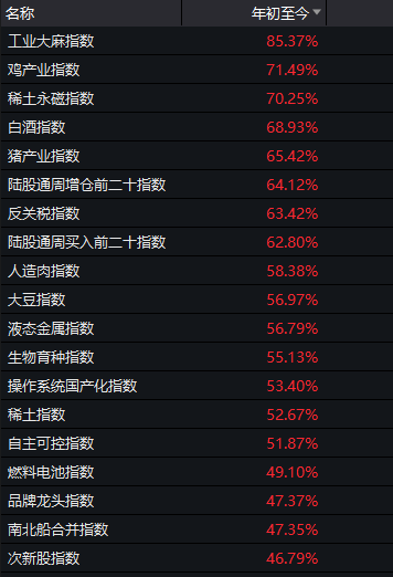 Wind概念板块数据显示,上半年热点板块涨幅最高的是工业大麻、鸡产业和稀土永磁,累计涨幅均超70%。此外,白酒、猪产业、反关税、人造肉、大豆、液态金属、生物育种、操作系统国产化、稀土、自主可控等板块指数均大涨逾50%。