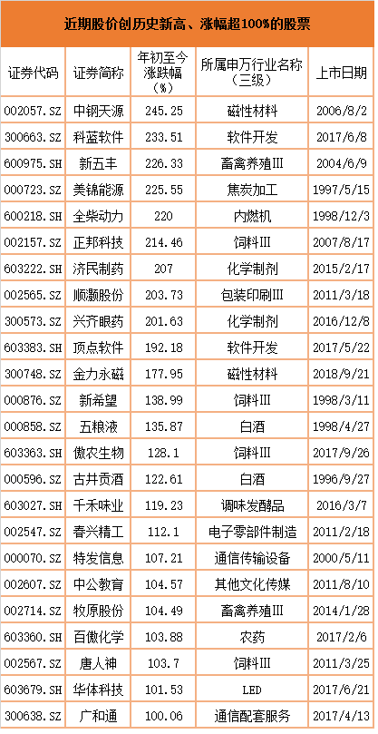 e公司记者统计发现,剔除新股,近期创历史新高的股票共128只。这些股票多集中在白酒、软件开发、饲料、生物制品、集成电路等热门板块。