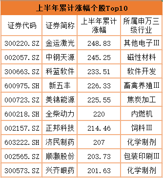 如果剔除ST股,从累计涨幅来挑选A股十大牛股的话,那么金运激光、中钢天源、科蓝软件分别以涨幅249%、245%、234%位居前三。其余七只股票分别为新五丰、美锦能源、全柴动力、正邦科技、济民制药、顺灏股份、兴齐眼药,这些股票半年涨幅均超200%。
