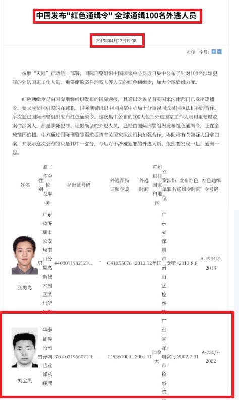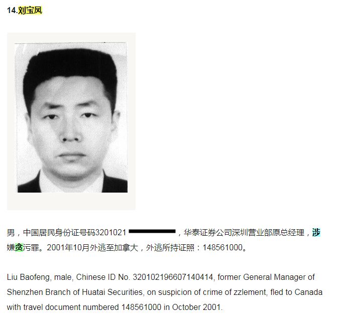 当时公布的信息是刘宝凤,华泰证券公司深圳营业部原总经理,涉嫌贪污罪。2001年10月外逃至加拿大,外逃所持证照:148561000。