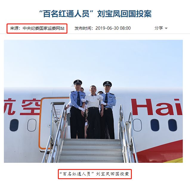 中纪委文章显示,2019年6月29日,在中央反腐败协调小组国际追逃追赃工作办公室统筹协调下,经广东省追逃办和深圳市监委不懈努力,外逃18年的“百名红通人员”、职务犯罪嫌疑人刘宝凤回国投案自首并积极退赃。