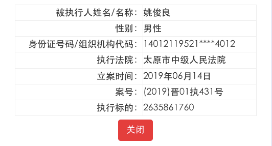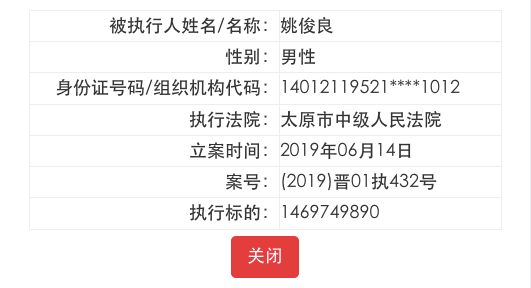 不仅是公司,太原市中级人民法院两次将姚俊良列为被执行人,但涉及的具体案件尚不得而知,从案号可见,他本人和美锦集团的两起案件有关。