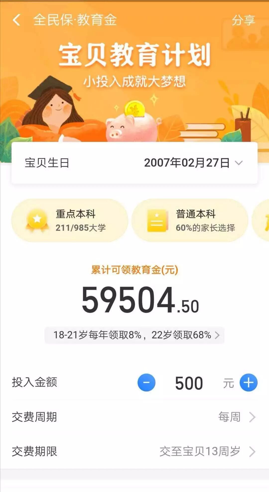 她截图给我看,她的孩子2007年2月生日,如果每周投入500元,缴费到13周岁,一共缴费19500,页面显示到22周岁一共可领取59504元。