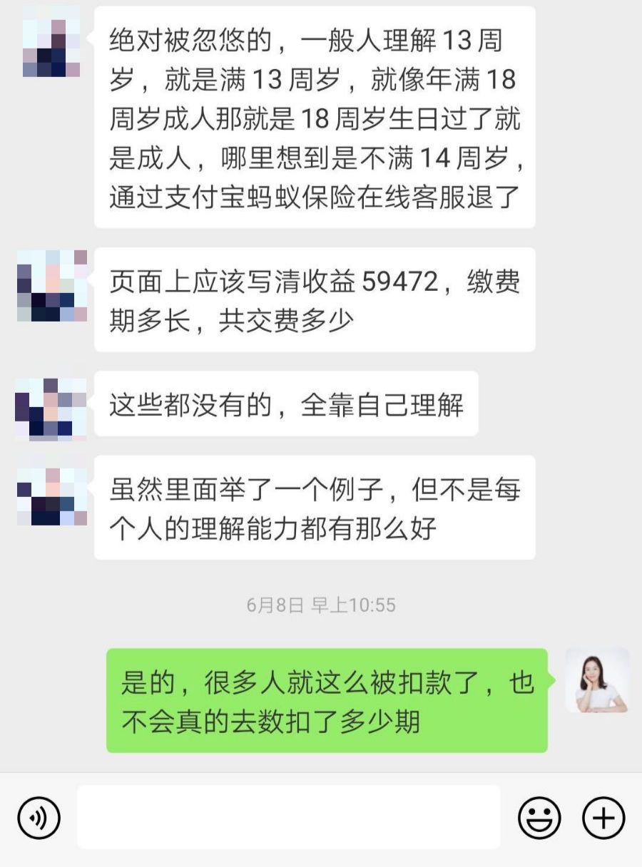 “如果不是咨询了你,那么我买了也就买了,保费是支付宝代扣的,谁会去数到底扣了几周呢?就算到时候发现了这个坑,也早就过了犹豫期,退保损失重大。”朋友说。