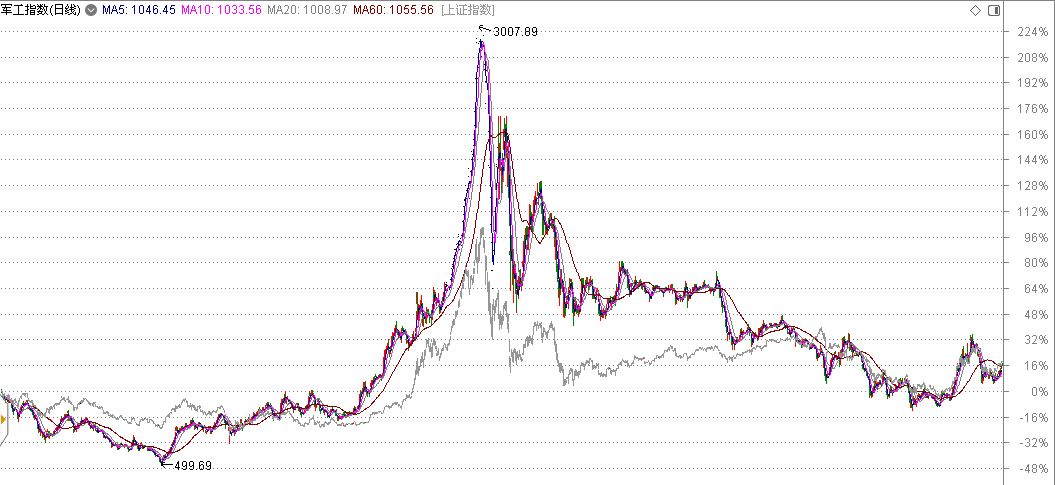 军工指数(彩色)叠加沪指(灰色)
