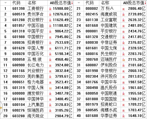 A股市值前40大公司排名