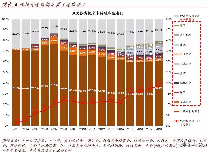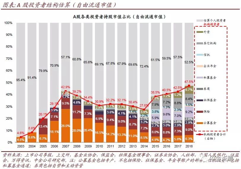 历史上A股散户占比高、市场投机气氛重、有效性弱,但随着A股近年不断开放以及本土机构投资者的发展,A股投资者结构正在逐步国际化、机构化,这也在逐步改变A股的表现特征,值得所有参与者重视。我们综合多方面数据估算来自大股东、基金、保险、外资等各类主要机构投资者及个人投资者在A股市场的持股,结果显示: