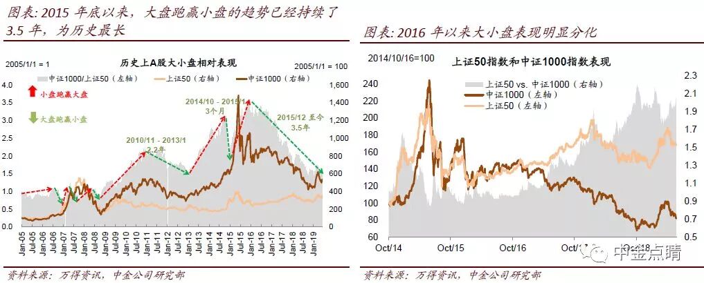 2)大盘蓝筹股长时间持续跑赢:2015年底以来,大盘跑赢小盘的趋势已经持续约3年半,为2005年以来的历史最长记录。