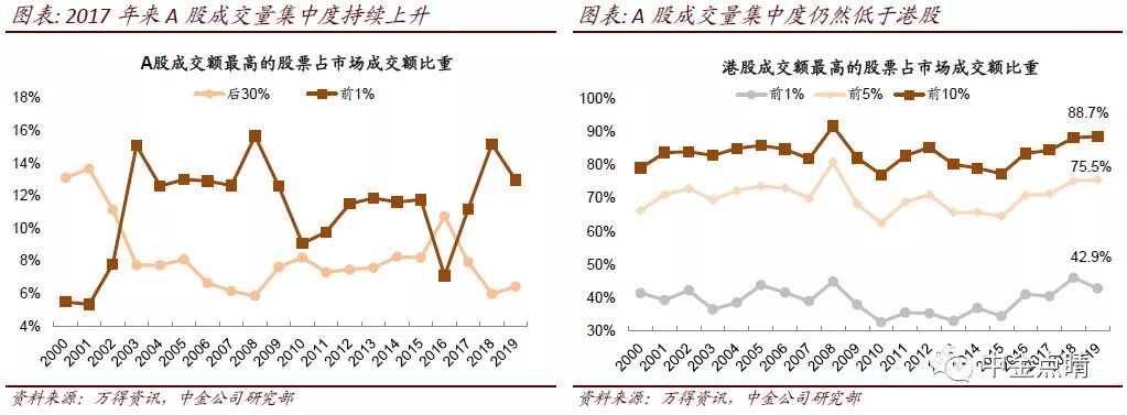 4)成交越来越向“龙头”集中:2018年,成交量前1%的A股合计占到市场成交量的15%,是2009年以来最高;成交量后30%的A股占市场成交的比例是6%,是2009年以来最低。
