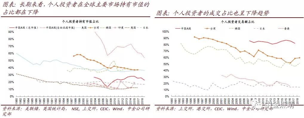 1)个人投资者持股比例已经显著降低。我们估算总市值中个人投资者持股的比例已经从2014年的28%下降到2018年的21%,而“自由流通市值”中个人投资者持股的比例已经从2014年的72%下降到2018年的53%。从持股结构来看,A股的“散户化”程度已经明显下降。