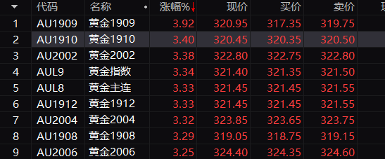 国内黄金期货早盘更是一度涨停,截至发稿,依然处于全线大涨中。