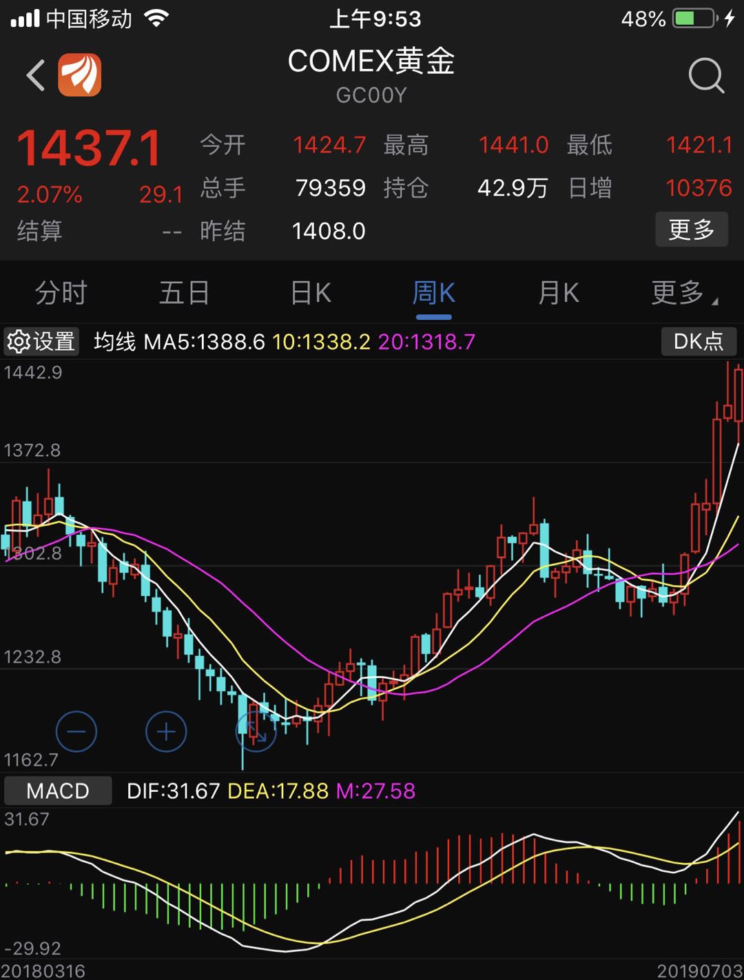 这是自6月25日之后,国际金价再度突破1440美元,而在六年之前,中国大妈以横扫世界金店而闻名,不过随后也套了近六年时间。自从美联储于6月初释放出降息信号之后,黄金价格就开始了主升浪,6月份以来,国际黄金的最大涨幅已经超过了9.5%。