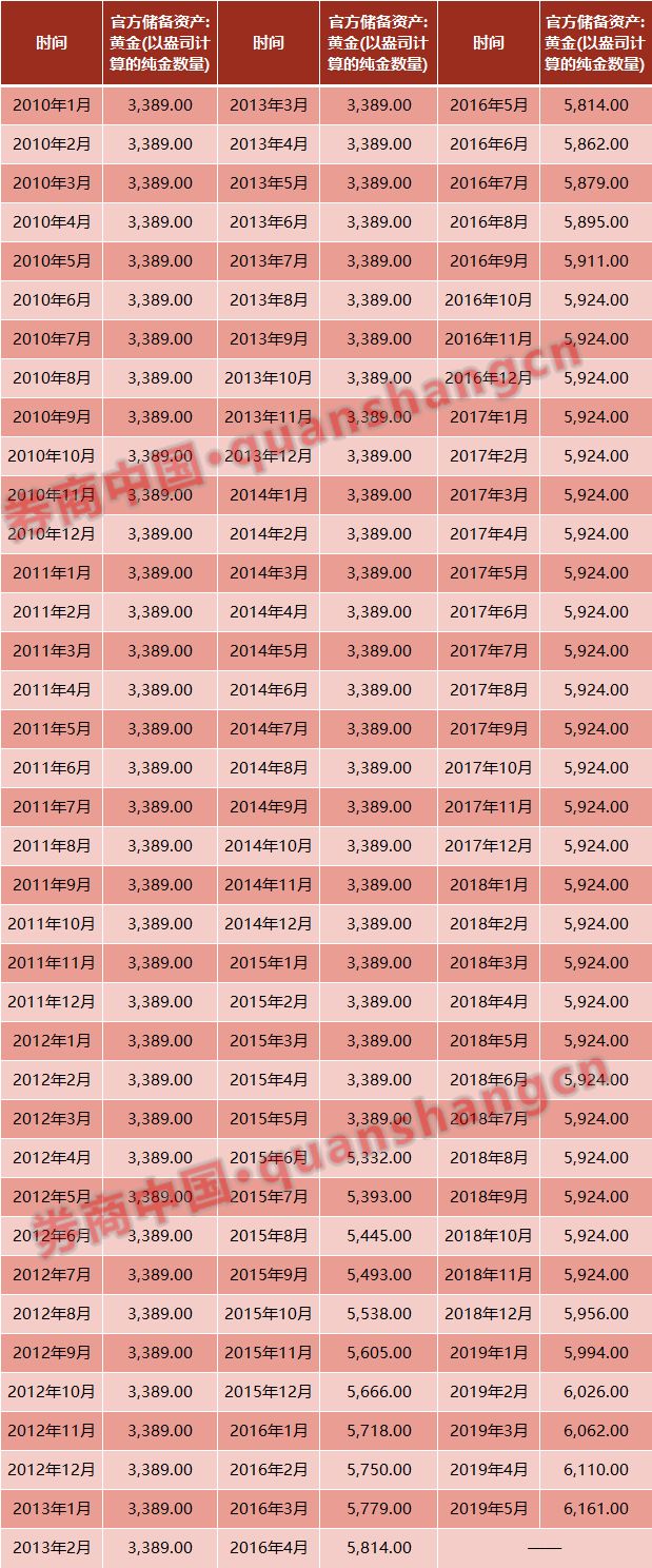 据中国央行公布的数据,自2018年12月至2019年5月,央行已经连续6个月增持黄金储备,从5924万盎司增加186万盎司至6110万盎司。另外,从数据来看,自2016年10月之后,央行在26个月时间里从未购买过黄金。直至2018年12月份,央行才重启增持模式。而从历史来看,央行多年以来,一直在增持黄金,而且每次对黄金的价格的把握都非常精准,可谓“最牛黄金多头”。