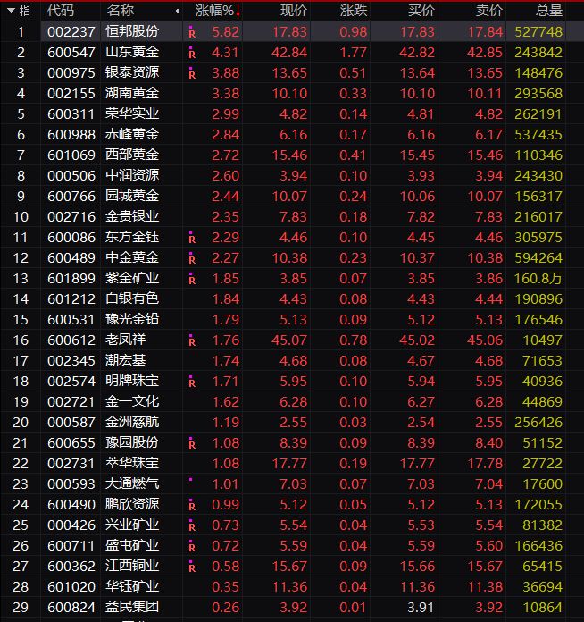 个股方面,黄金概念股多数上涨。