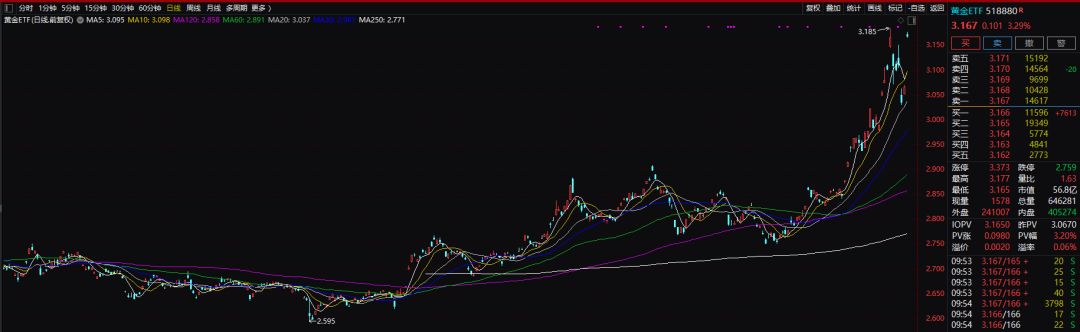 主力黄金ETF(518880)近期亦大幅上涨,今日涨幅罕见超过3%。