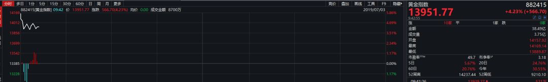 A股市场黄金概念股今日大幅上扬。Wind黄金指数今日大涨超4%,从5月最低位至今,该指数涨幅已近40%。黄金概念股全线上涨,其中恒邦股份、银泰资源、山东黄金涨幅居前。