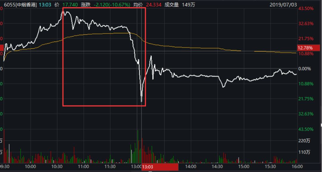 3日,中烟香港早盘还一度暴涨43.5%,接近午盘时叕叕下跌,一度跌24%。虽然截止收盘中烟香港已经收复了部分“绿地”,下跌3.42%,报收19.18港元,但是一天之内股价就被腰斩的振幅也吓破了不少投资人的胆儿。
