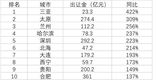21世纪经济报道记者梳理发现,三亚、太原、兰州、哈尔滨、深圳、北海6所城市土地出让金涨幅超过200%。其中三亚增速最快,同比增加422%;而深圳也以223%的增速成为上半年土地出让金增幅前十榜单中唯一的一线城市。