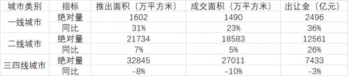 与此相比,三四线城市的土地则在供求两端均呈下降趋势,土地供应量为32845万平方米,同比减少8%,成交面积27011万平方米,同比减少10%。受此影响,上半年三四线城市的土地出让金为7433亿元,同比减少3%。