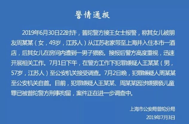 被猥亵女童事后向在江苏的母亲打电话哭诉,母亲第二天向上海市普陀区警方报案;之后,女童验伤情,阴道有撕裂伤,构成轻伤;