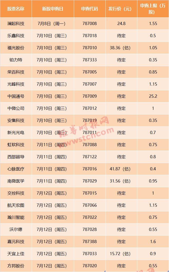 此外,澜起科技、乐鑫科技、铂力特、中国通号等21家科创板公司也将分别于本周一(7月8日)、本周三(7月10日)、本周四(7月11日)和本周五(7月12日)启动申购,21家公司拟共发行25.92亿股,其中本周一可申购的澜起科技已公布发行价格,为24.80元。
