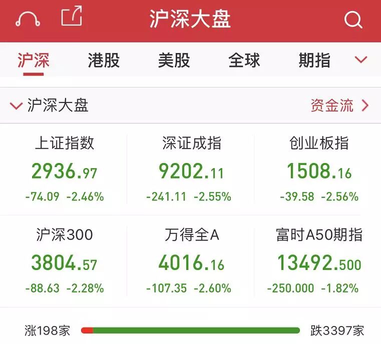 美国资本市场的表现引发了今早开盘的亚太股市的抛售潮,今天一早A股市场即出现了大幅跳水的情况。上证指数一度杀跌超过90点,跌幅亦超3%;核心资产上证50的最大跌幅亦超过2.8%;A股市值单日跌破1万亿元人民币。截至上午收盘,两市仅有203只股票上涨,3395只股票杀跌。所幸的是,跌停股票仅为6家,而涨停的有14家。