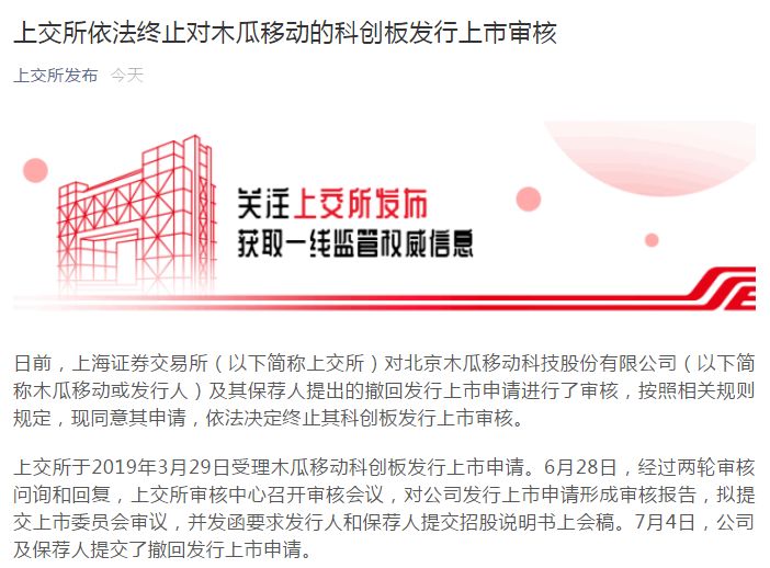 7月8日,上交所官网显示,上交所对北京木瓜移动科技股份有限公司(以下简称木瓜移动或发行人)及其保荐人提出的撤回发行上市申请进行了审核,按照相关规则规定,现同意其申请,依法决定终止其科创板发行上市审核。