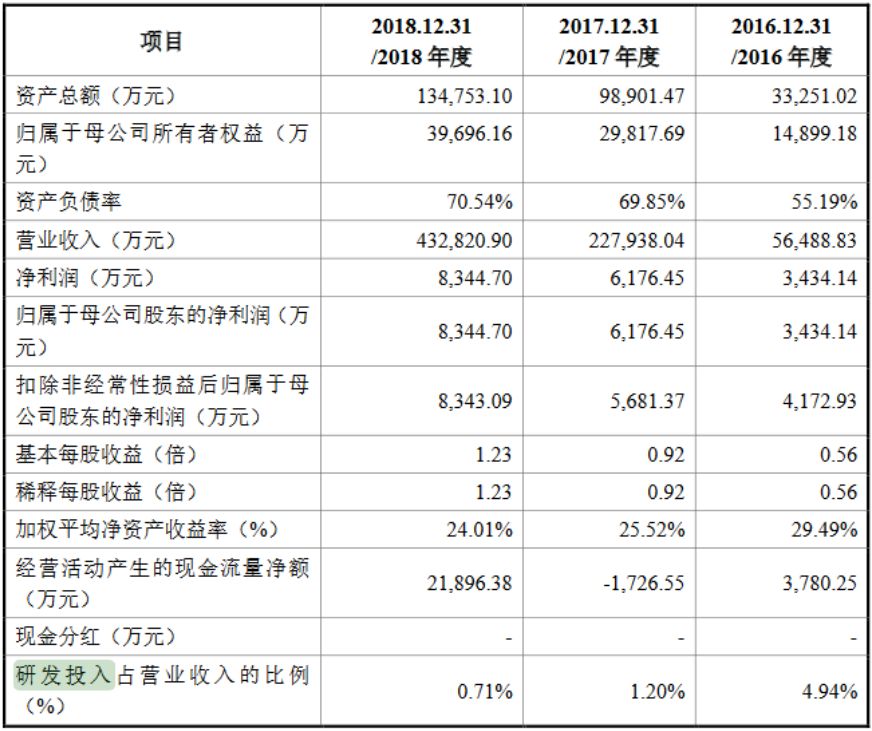 根据近三年财务数据来看,木瓜移动2016年-2018年营业收入实现了大幅增长,自2016年的5.65亿元迅速攀升至43.28亿元;净利润水平同样自2016年的3434.14万元升至8344.70万元。不过,其2018年研发投入占比营收仅有0.71%,在科创板申报企业中排在尾部。