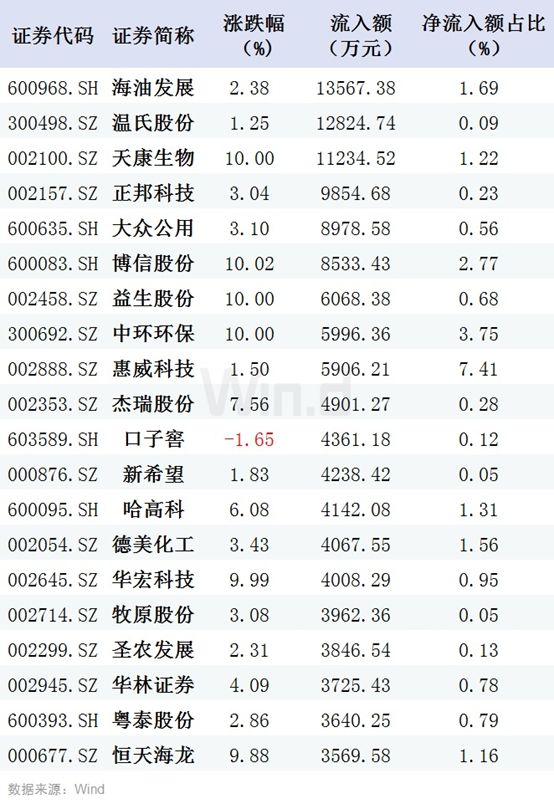 净流入方面,周一当日海油发展、温氏股份、天康生物获主力资金逾亿元净流入。此外,还有77只个股获得主力资金逾千万净流入。