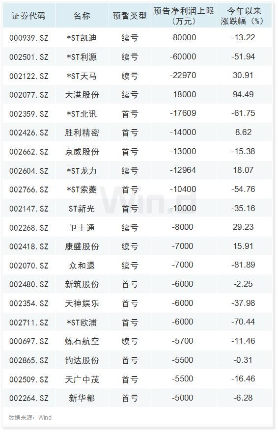 *ST凯迪、*ST利源、*ST天马、大港股份、*ST北讯、胜利精密、京威股份、*ST龙力、*ST索菱、ST新光等10股预计上半年亏损金额将超亿元。