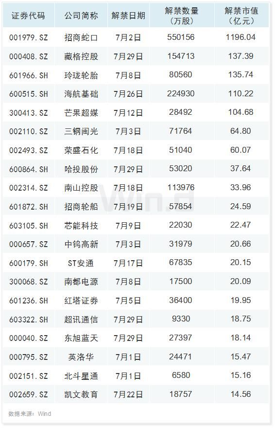 其中,招商蛇口解禁市值超过千亿元,藏格控股、玲珑轮胎、海航基础、芒果超媒建等4只个股限售股解禁市值超过百亿。