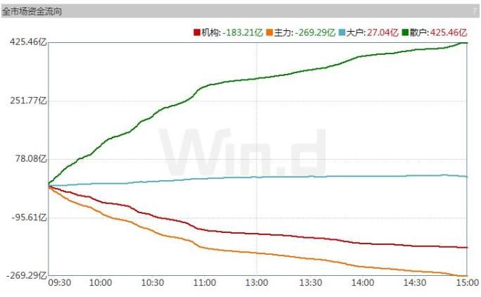 从全市场资金流向看,周一,机构、主力资金合计净流出452.50亿元,其中主力资金净流出269.29亿元。与之相对的是,散户资金跑步入场,全天累计净流入425.46亿元。
