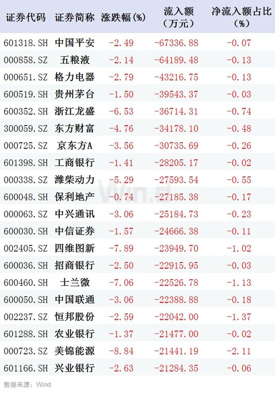 净流出方面,周一当日中国平安、五粮液、格力电器分别遭遇主力资金6.73亿元、6.42亿元、4.32亿元的净流出。此外,还有77只个股净流出规模过亿。