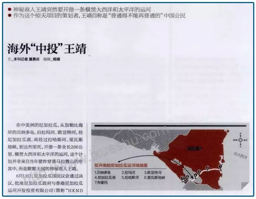 2014年,王靖宣布公司将在尼加拉瓜开挖运河,总投资500亿美元。