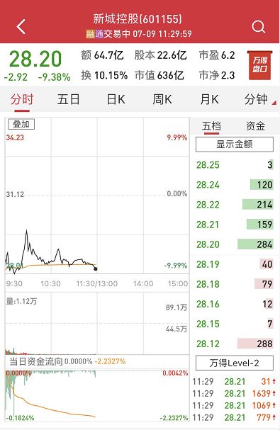 7月9日开盘时,新城控股打开一字跌停板,跌9.67%,成交73万手,金额20.6亿元。截至午间收盘,新城控股跌幅收窄,股价报28.20元/股,跌9.38%。成交方面,早盘期间,共成交64.7亿元,成交量达228万手,换手率达10.15%。